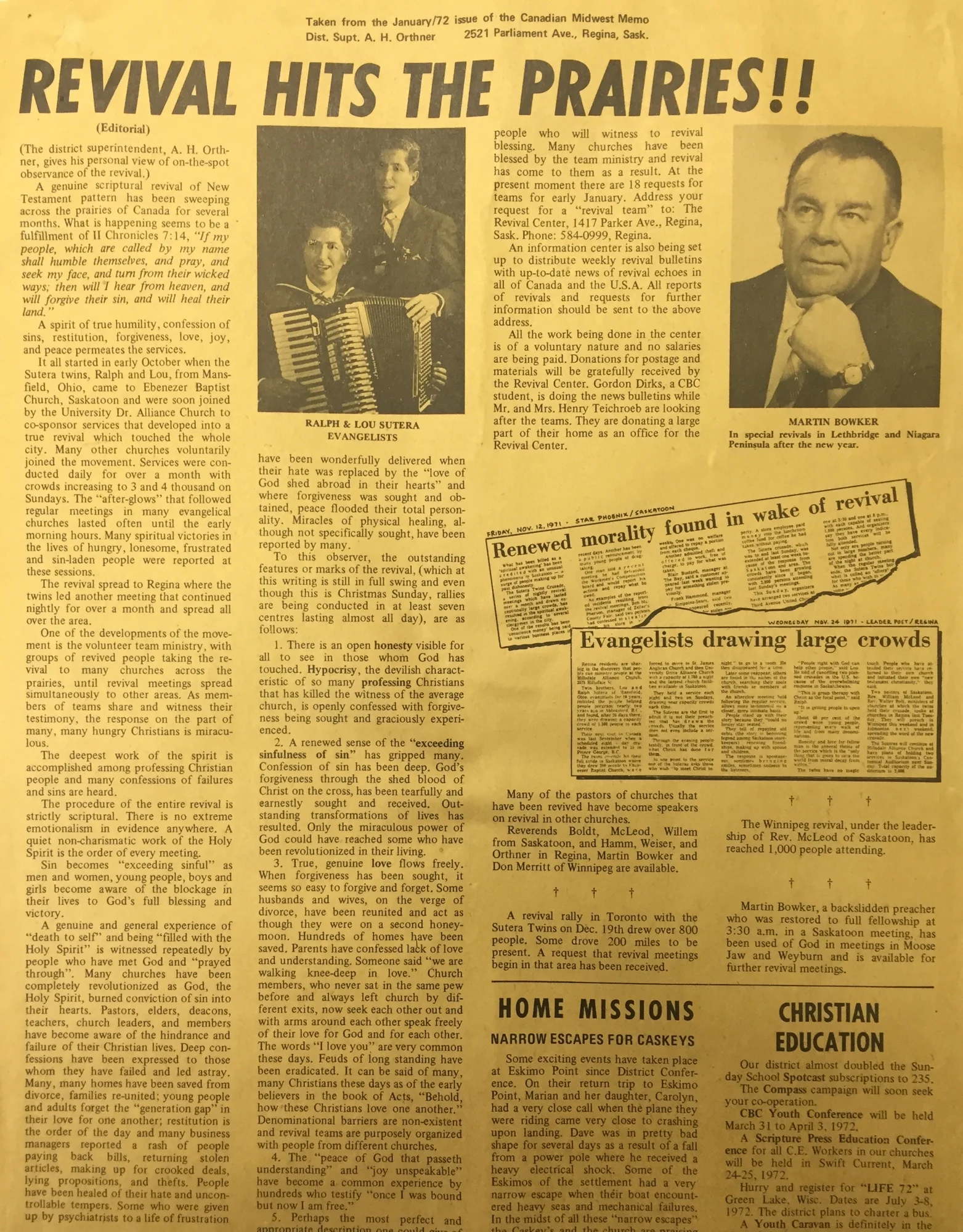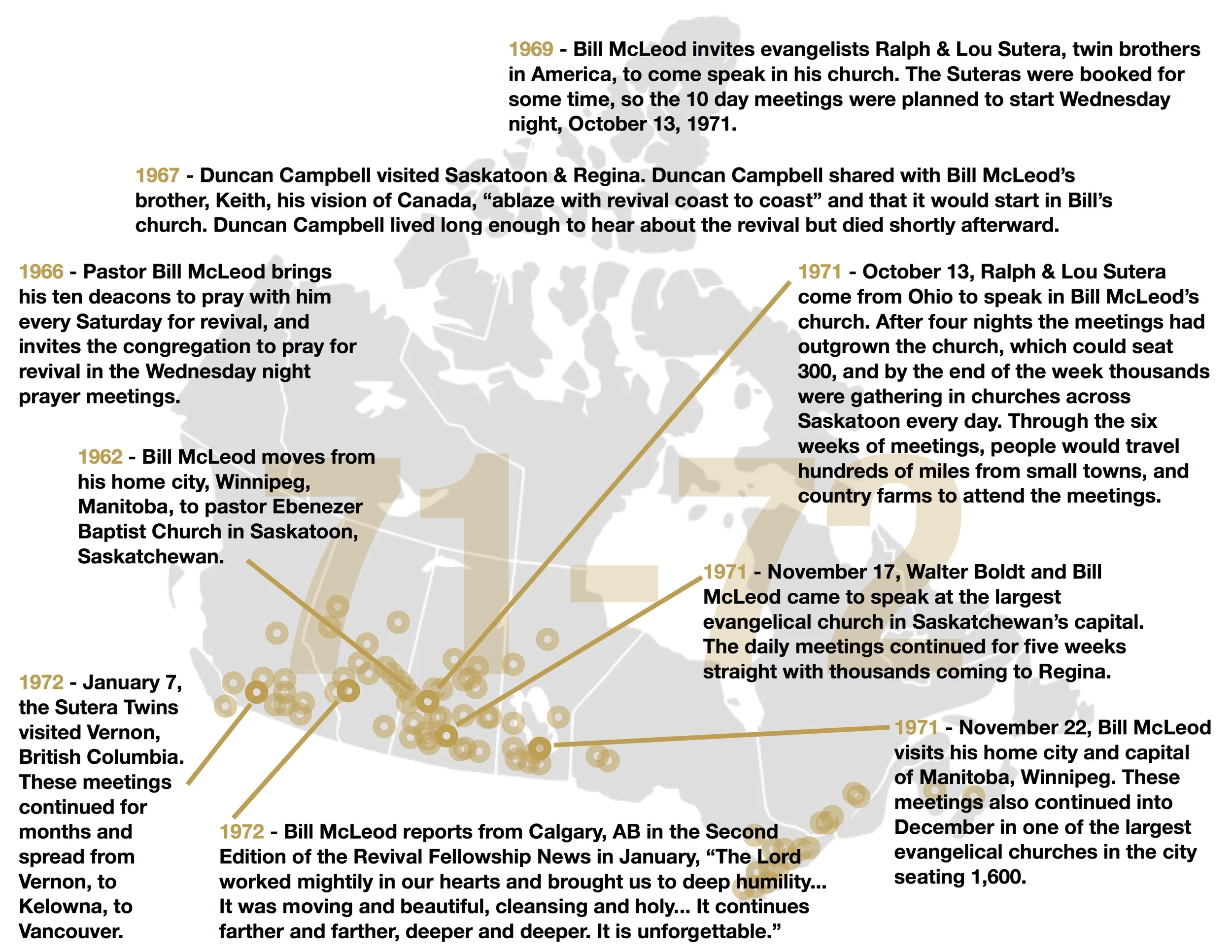 Finally, Pastor Bill invited two evangelists, Ralph & Lou Sutera, to speak to his congregation. With much anticipation the first night of the meetings came, but nothing happened. The first night passed, the second, the third, but on the fourth night, October 17, 1971, God in His sovereignty came in revival. Without human means or explanation, the revival spread from church to church, community to community, city to city, and not long after from province to province.